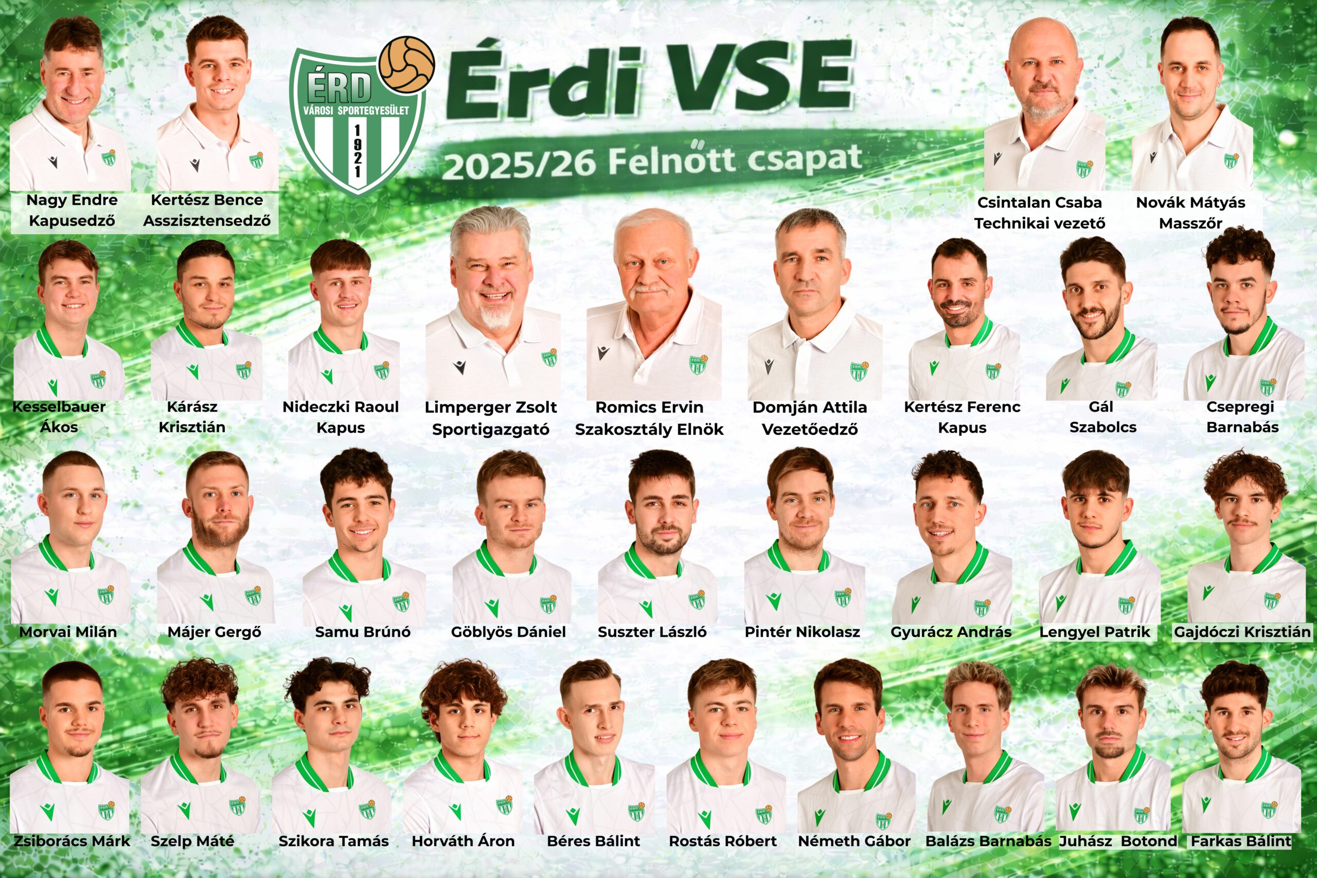 Csapat Érdi VSE 2025-2026 Kapusok Kertész FerencMezszám: 91Poszt: kapusNideczki Raoul LucaMezszám: 1Poszt: kapus Védők Balázs Barnabás Mezszám: 99Poszt: védő Németh GáborMezszám: 11Poszt: védő Csapatkapitány Gyurácz András Mezszám: 13Poszt: védő Gál SzabolcsMezszám: 20Poszt: védőSzikora TamásMezszám: 5Poszt: VédőPintér NikolaMezszám: 14Poszt: védőcsapatkapitány-helyettesBéres BálintMezszám: 24Poszt: védőKárász KrisztiánMezszám: 4Poszt: védőZsiborács MárkMezszám: 15Poszt: védő Közzépályások Farkas Bálint Mezszám: 10Poszt: középpályásGöblyös DánielMezszám: 21Poszt: középpályáscsapatkapitány-helyettesJuhász BotondMezszám: 17Poszt: középpályásMorvai MilánMezszám: 6Poszt: középpályásSzelp MátéMezszám: 23Poszt: középpályásRostás Róbert Mezszám: 18Poszt: középpályásGajdóczi KrisztiánMezszám: 12Poszt: középpályásKesselbauer ÁkosMezszám: 19Poszt: középpályásMájer GergőMezszám: 8Poszt: középpályás Támadók Samu BrúnóMezszám: 22Poszt: támadóSuszter LászlóMezszám: 7 Poszt: TámadóLengyel PatrikMezszám: 29Poszt: támadóCsepregi BarnabásMezszám: 9 Poszt: támadó Horváth ÁronMezszám: 25Poszt: támadó SZAKMAI STÁB Romics Ervin SzakosztályvezetőLimperger Zsolt SportigazgatóDomján Attila vezetőedzőKertész BenceAsszisztens edzőNagy EndreKapusedzőCsintalan CsabaTechnikai vezetőNovák MátyásGyúró